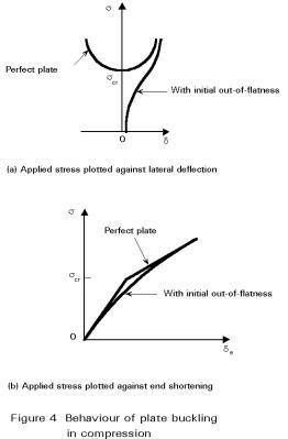 La résistance postflambement apparaît en particulier sur les plaques qui ont des proportions réduites et qui, jusqu'à une certaine limite, se comportent de manière élastique. Dans ce cas, la charge ultime peut être égale à plusieurs fois la charge critique élastique. Pour des plaques d'élancement faible ou intermédiaire, c'est la plasticité du matériau qui affecte principalement le comportement de la plaque ; en fait plus la plaque est massive, plus l'écoulement plastique aura tendance à précéder le voilement, ce qui donnera lieu à une résistance ultime éventuellement plus faible que la charge critique élastique. Les processus de mise en uvre et de fabrication d'une plaque donnent lieu à des imperfections géométriques inévitables et à des contraintes résiduelles. Dans la plupart des cas, les deux ont des effets sur le comportement pré- et postflambement. |