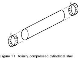 | Le flambement des coques est probablement le phénomène d'instabilité le plus complexe. Analogue au voilement, il fait plutôt intervenir la forme de la section droite que le déplacement de la section droite considérée comme un tout. Les contraintes de compression, comme auparavant, peuvent naître des efforts normaux de compression, de la flexion et de charges concentrées appliquées localement. De plus, cependant, les coques peuvent aussi être soumises à des pressions internes ou externes (tuyaux, silos, réservoirs, poteaux supports des plates-formes offshore, etc. ) |