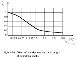 | Selon les Recommandations de la CECM, la valeur de ce facteur ne dépend que de l'élancement r/t de la coque sous réserve de conserver les imperfections en dessous d'un seuil donné. On applique un facteur de sécurité partielle supplémentaire, g, au cas des coques cylindriques soumises à une compression méridienne à cause de leur comportement postflambement particulièrement défavorable. |